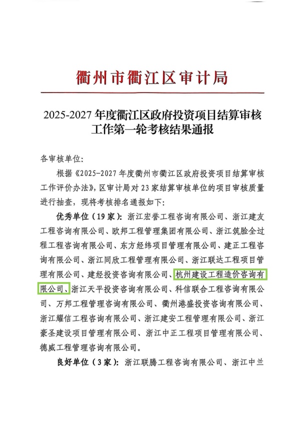 2025-2027年度衢江区政府投资项目结算审核工作第一轮考核优秀单位